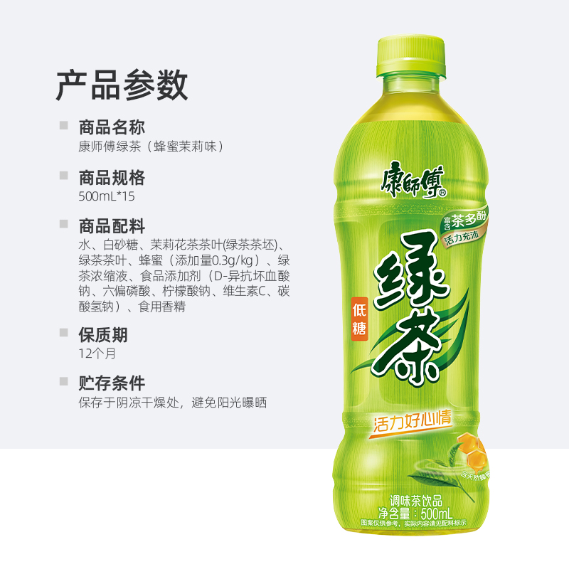 Ingredients : Purified water, white granulated sugar, jasmine tea leaves (green tea), green tea, honey 0.3g/L, green tea concentrate, food additive (D-Sodium erythorbate, hexametaphosphate, sodium citrate, vitamin C, Sodium bicarbonate), edible essence